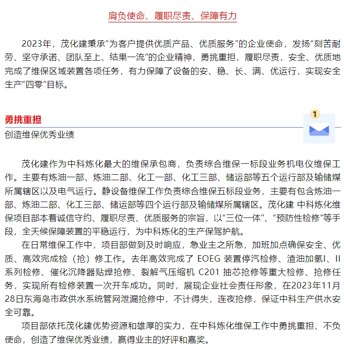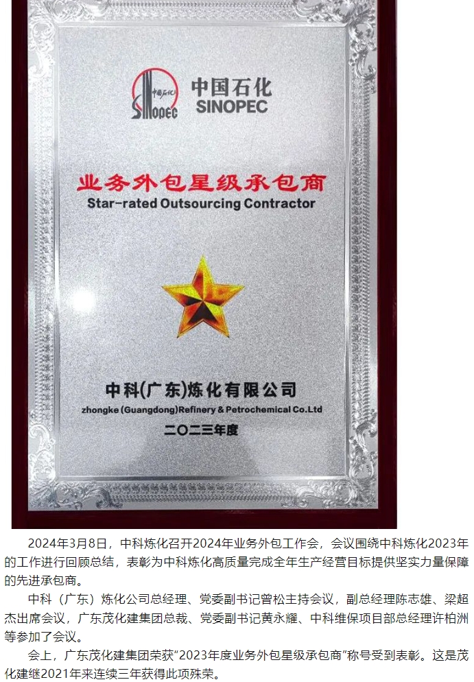 喜報(bào):榮獲中科煉化“2023年度業(yè)務(wù)外包星級承包商”稱號