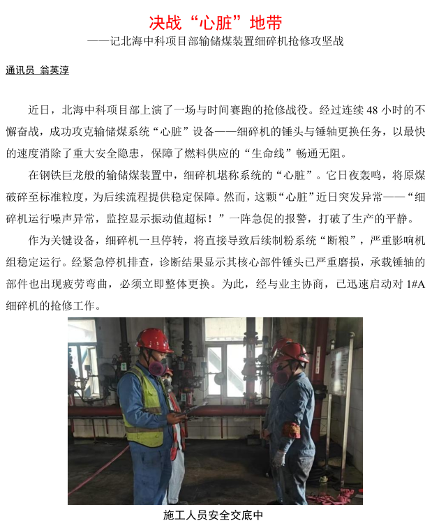 北海中科項目部輸儲煤裝置細碎機搶修攻堅戰(zhàn)