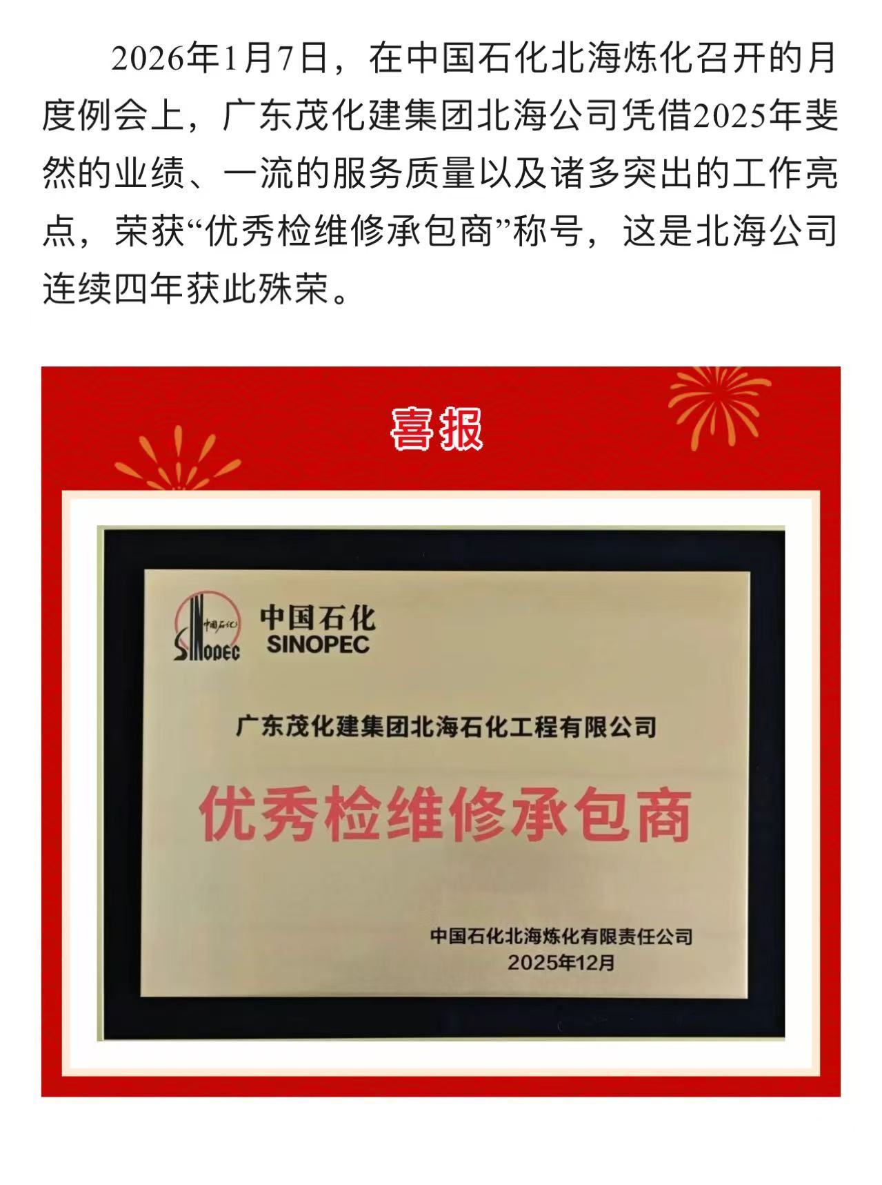 喜報(bào) | 廣東茂化建集團(tuán)北海公司榮獲2025年度“優(yōu)秀檢維修承包商”稱號(hào)