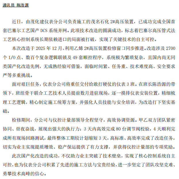 儀表分公司圓滿完成全國首套巴塞爾工藝國產(chǎn)DCS 系統(tǒng)并網(wǎng)改造